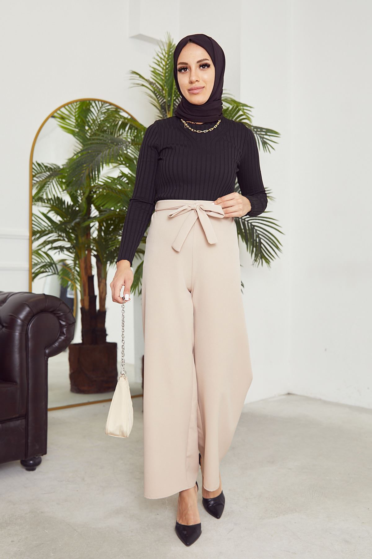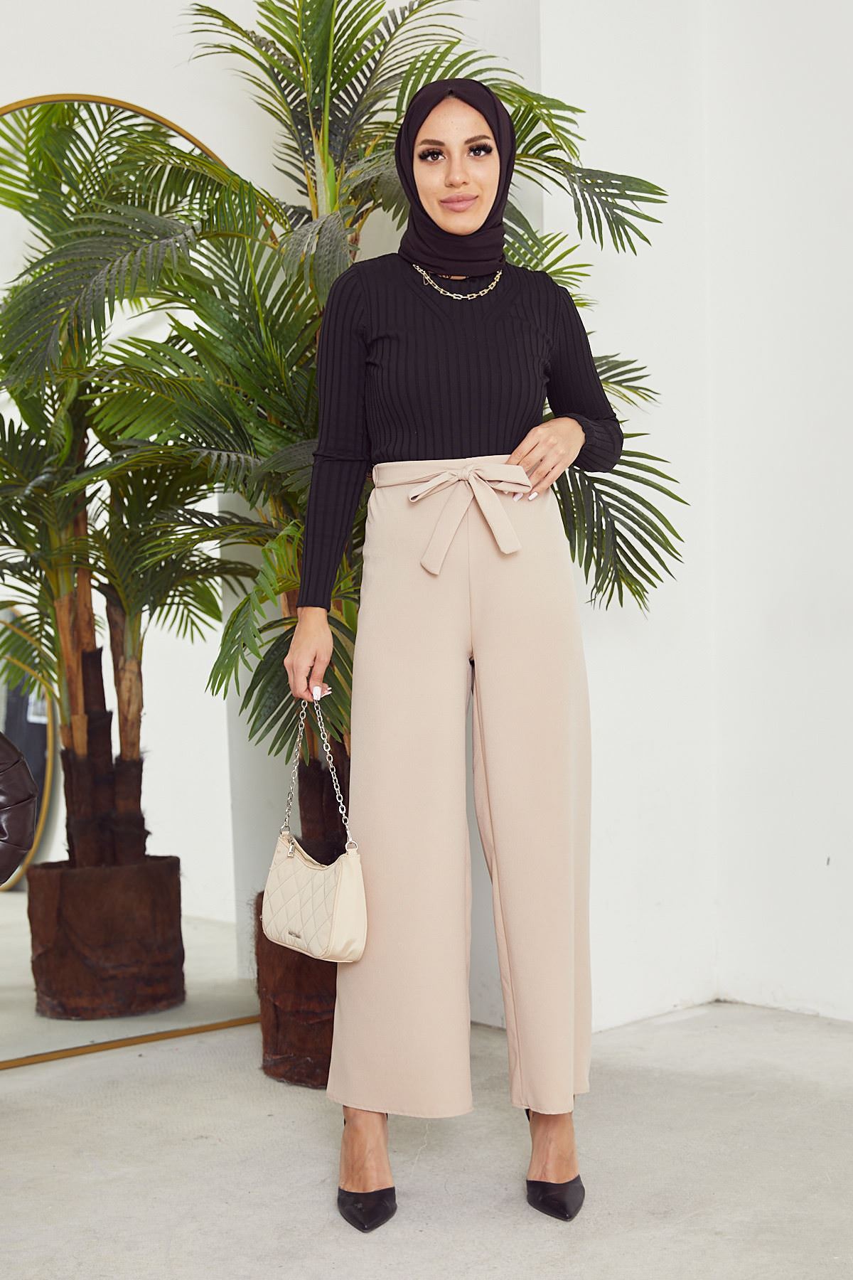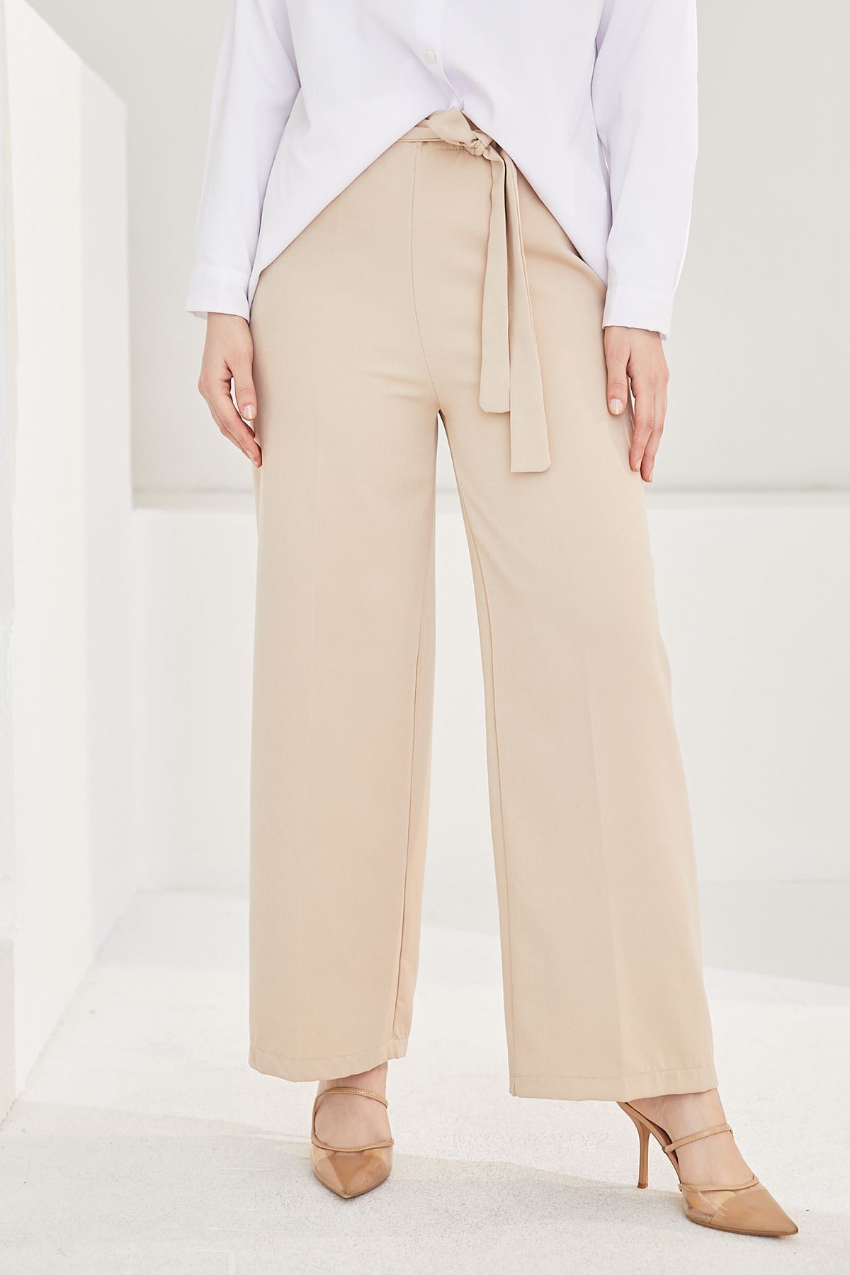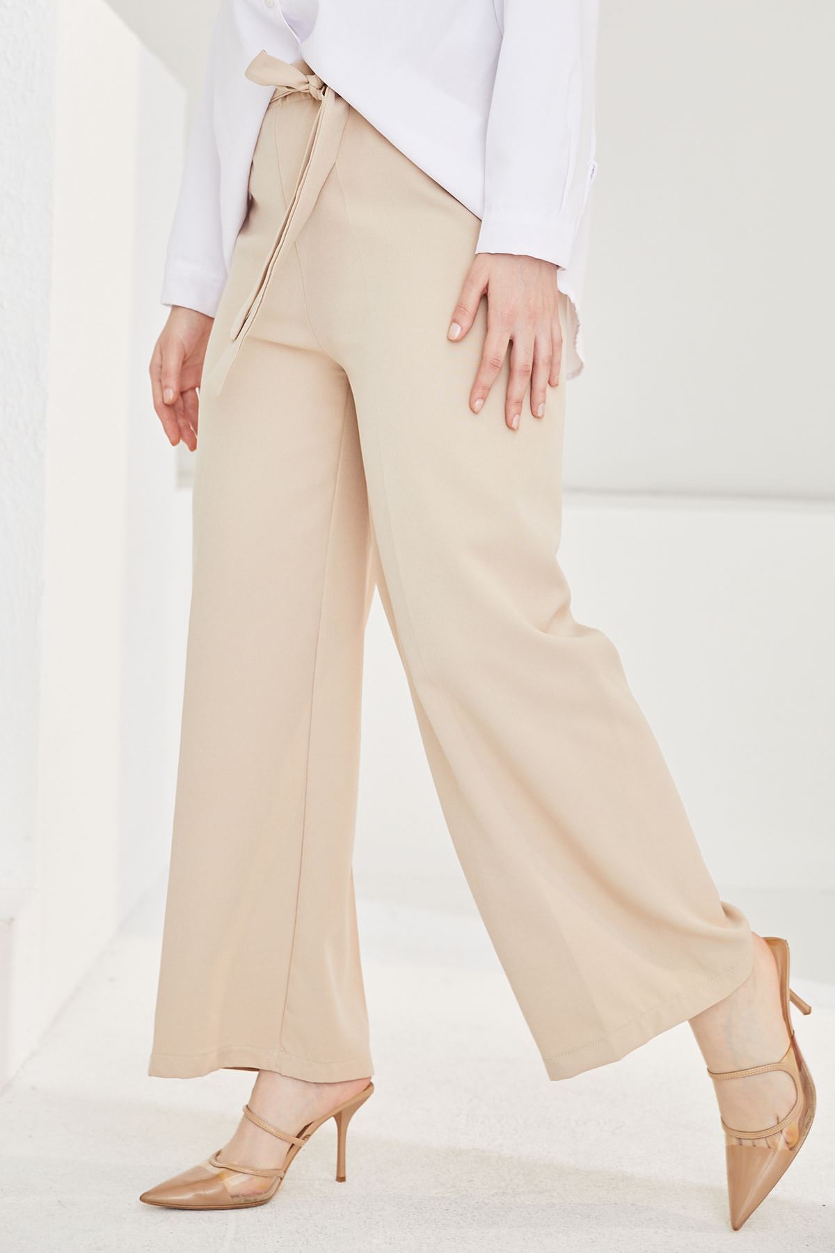 Kadın Beli Lastikli Bağlama Detaylı Geniş Paça Tesettür Pantolon-Taş
