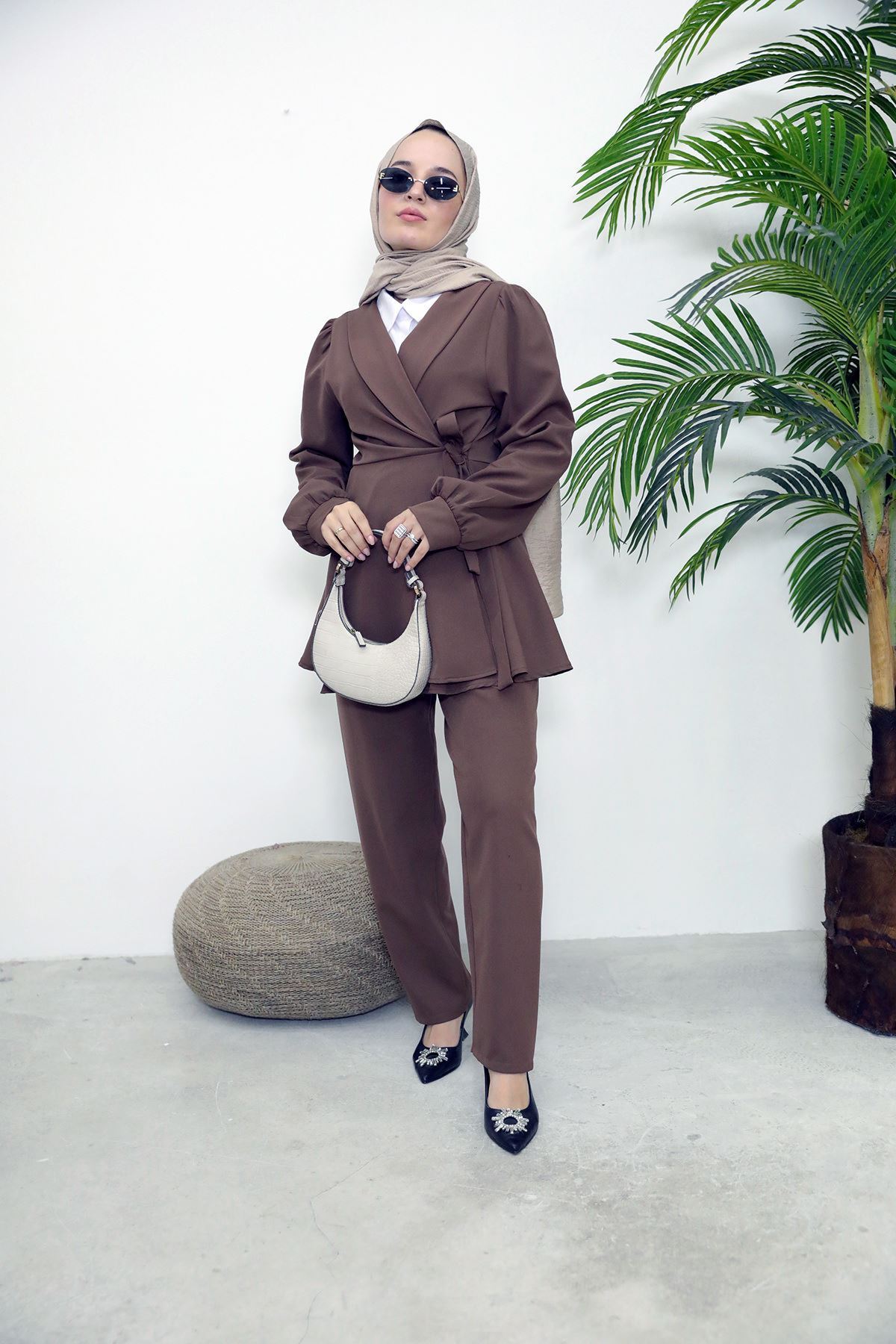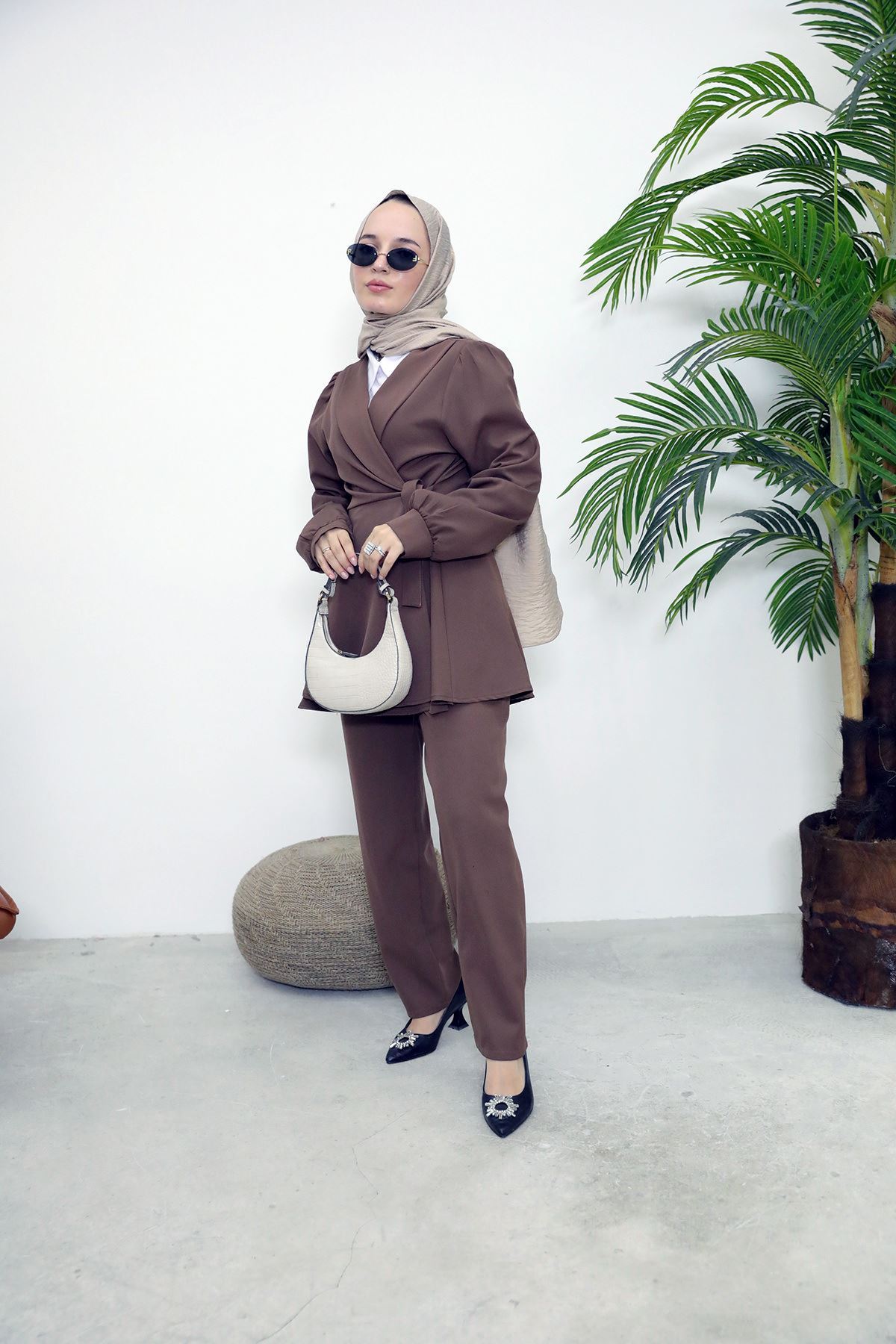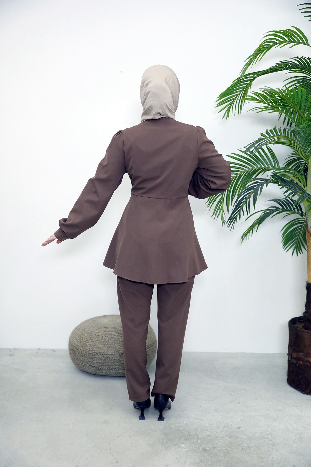 Kuşak Detay Ceketli Takım-Kahve