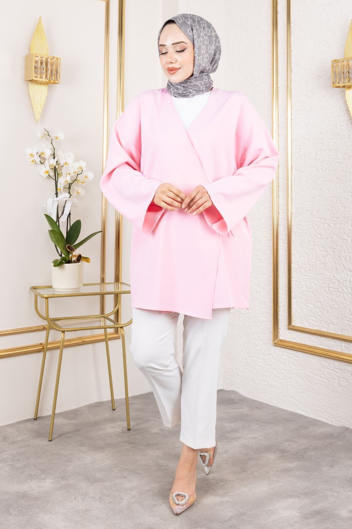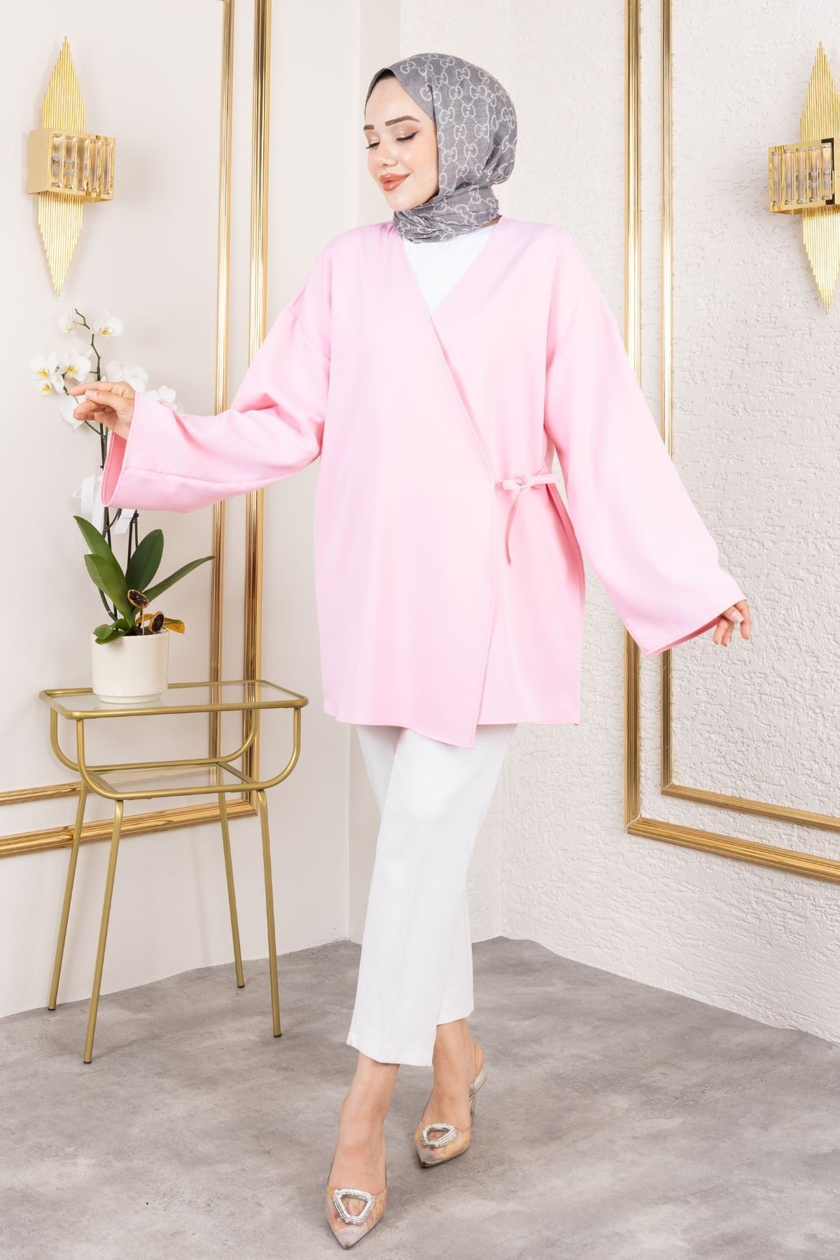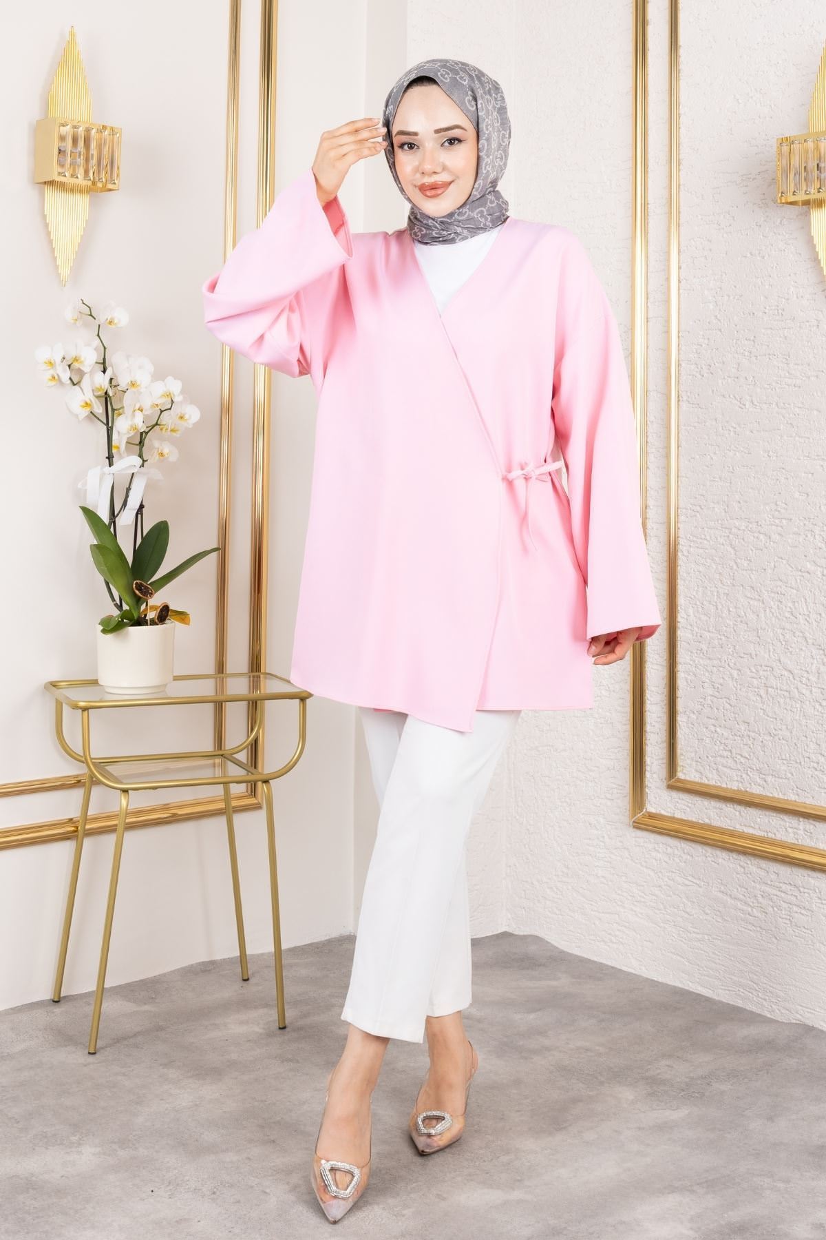 Yan Bağlamalı Atlas Tunik-Pembe